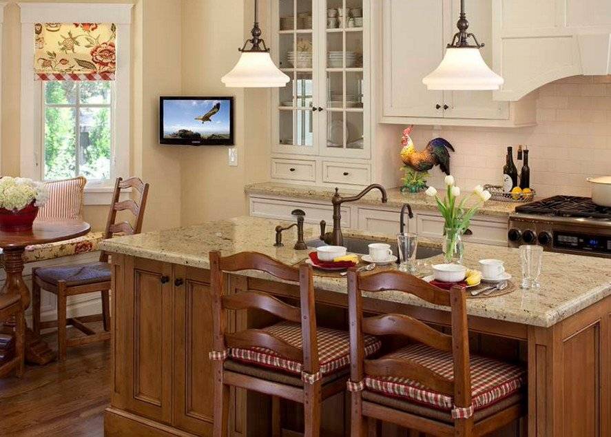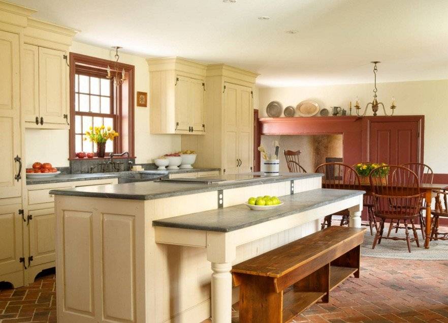 Камень можно использовать для облицовки колонн или перегородок в кухнях-гостиных. Для большей гармонии материал может перекликаться с каменной плиткой, которая применяется для отделки кухонного фартука. Гранитная столешница и деревянная мебель, подобранные в тон каменной кладке, выгодно дополняют данный тандем, что отображают фото кухни кантри.