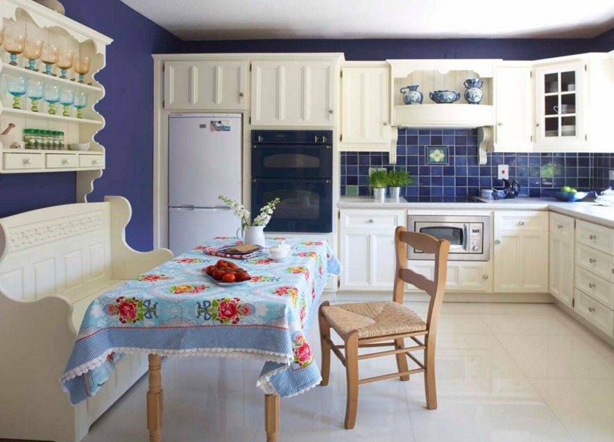 Кухни в стиле кантри с чертами прованса – это, конечно, интерьер с характером французской деревни. Задумав такую кухню, ориентируйтесь на материалы жизнерадостных оттенков, с преобладанием теплых тонов. Основой палитры будут молочный и белый. Смело разбавляйте их желтым, бирюзовым, желтым или лавандовым. Как и многие другие стили, кантри прованс не любит смешения трех и более цветов. К молочному цвету стен отлично подойдет мебель приглушенного зеленого или песочного цвета.