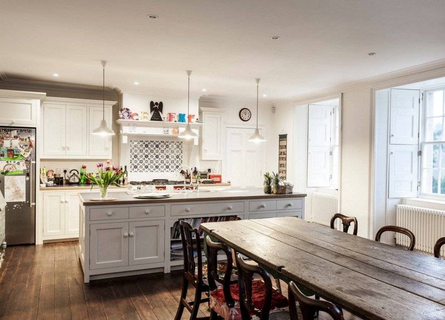 Главное украшение комнаты в стиле кантри – большой камин. Он редко встречается на кухне, но будет уместен в просторной совмещенной кухне-гостиной с отдельной обеденной зоной