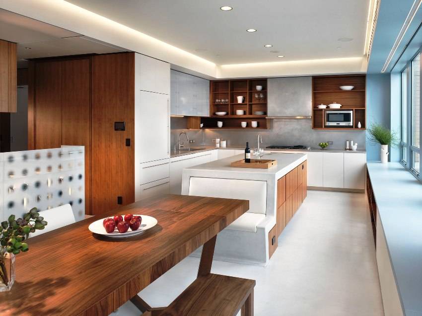 Потолок должен быть светлым, лучше матовым, но уместен и глянец. Он может быть покрыт штукатуркой или краской, оптимален натяжной потолок, а если высота позволяет, то кухню-гостиную лучше разграничить гипсокартонным двухуровневым потолком. Ниже — фото (листайте вправо).