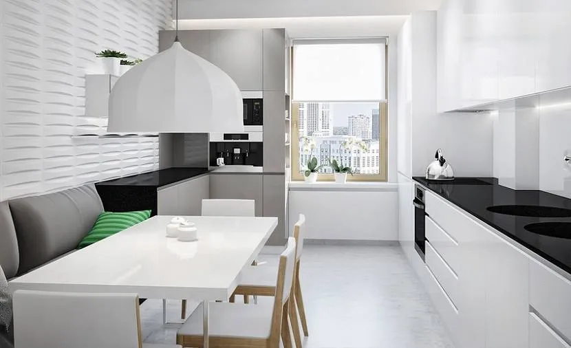 - Двухрядная. Оптимальное решение для узких и вытянутых кухонь с окном, расположенным в торце комнаты. В этом случае мебельный гарнитур устанавливают вдоль самой длинной стенки, а обеденную зону выносят к окну.