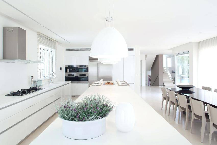 При подборе отделочных материалов особое внимание обращают на их свойства, которые должны полностью подходить под условия кухни – быть практичными и долговечными. Минимализм на кухне часто воссоздают с помощью белого цвета