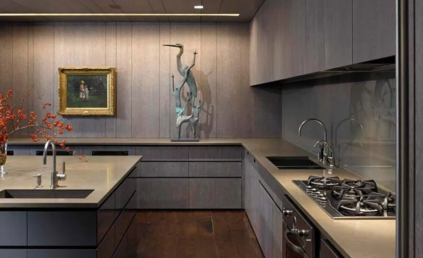 - Фартук. Кухонный фартук можно выделить деревом, натуральным или искусственным камнем, мозаикой, хромированной сталью или бесцветным закалённым стеклом, которое будет сочетаться со сдержанными фасадами и однотонной фурнитурой.