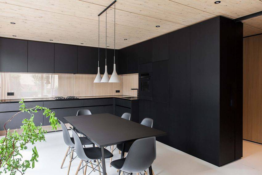 - практически не используются открытые полки, вся бытовая техника, кухонная утварь находятся за мебельными фасадами или раздвижными панелями, ко всему должен быть лёгкий и быстрый доступ