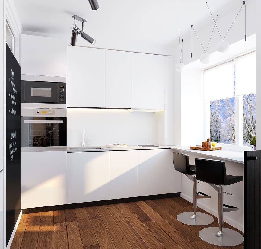 Принцип такой планировки аналогичен угловым гарнитурам с барной стойкой. Только вместо нее часть рабочей поверхности переходит в обеденную зону. Это позволяет сэкономить место и не загромождать кухню отдельным столом.