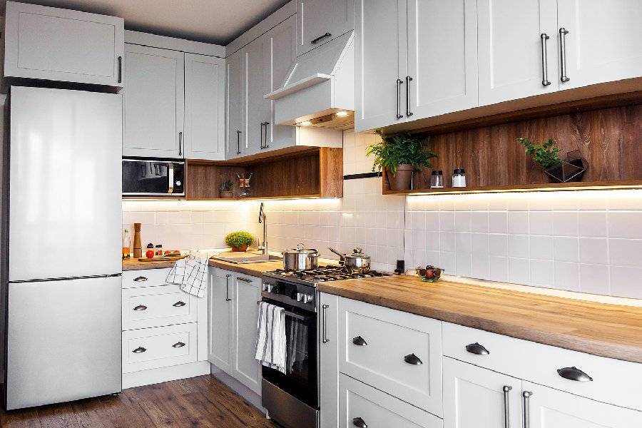 Покупка белой кухни всегда будет вне времени и отлично подойдет для коттеджей, традиционных и современных интерьеров. Двухцветная мебель создаст приятный контраст.