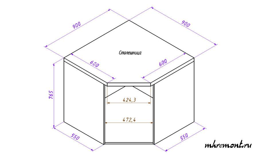 Угловая тумба под мойку (чертеж см. выше) часто используется если площадь помещения позволяет, для маленьких кухонь прямой шкаф. Таким образом, в прямой устанавливается прямоугольная или круглая мойка, в угловой – угловая или круглая.