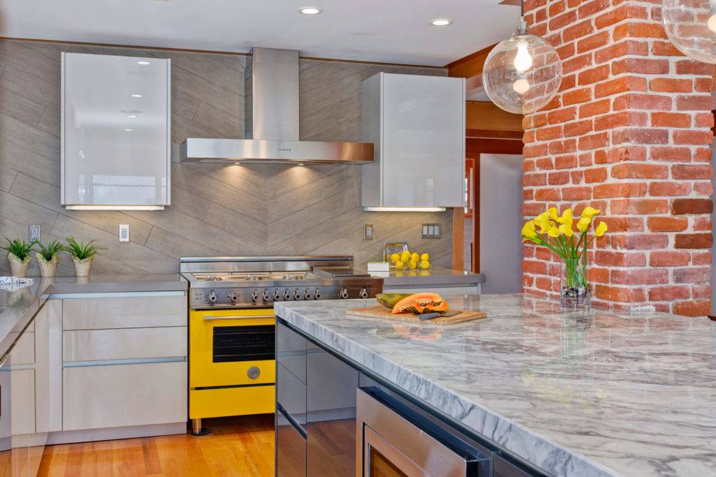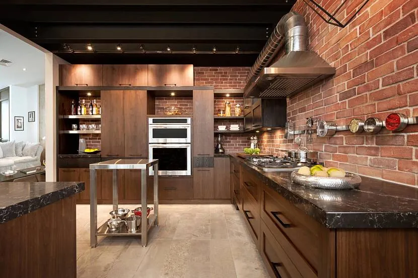 Индустриальный, городской стиль лофт подходит для кухонь просторных, с высоким потолком. Упор здесь делают на брутальный внешний вид, натуральное дерево и металл, поэтому детали интерьера и фасады достаточно массивные, как и остальная мебель в обеденной зоне. Фасады закрытые, с прямой фрезеровкой или без нее. Цвет выбирают черный, молочный, дерево, коричневый, бежевый.