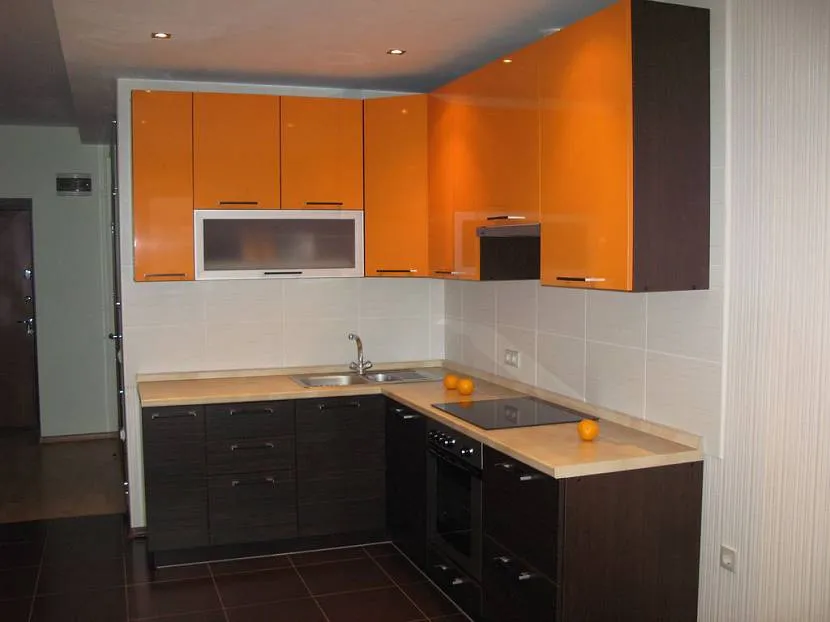 Недостатки угловой кухни совсем незначительны. К ним относят определенный дискомфорт при пользовании угловыми тумбами, соединенными между собой под прямым углом. Такая компоновка мебели характерна для маленьких кухонь, где установить большую угловую тумбу не получается. Также отметим, что на этапе проектирования угловой кухни небольшого размера возникают определенные трудности с учетом выступов, кривизны стен иного рода дефектов. Хотя подобных проблем не избежать и при подборе кухонного гарнитура иной конфигурации.