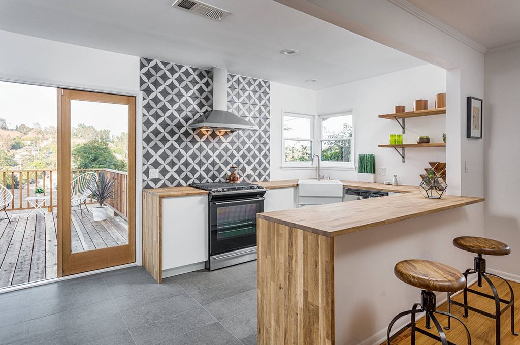 Угловой кухонный гарнитур в горизонтальную полоску расширит пространство