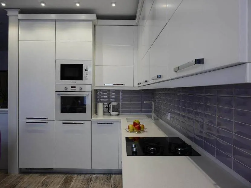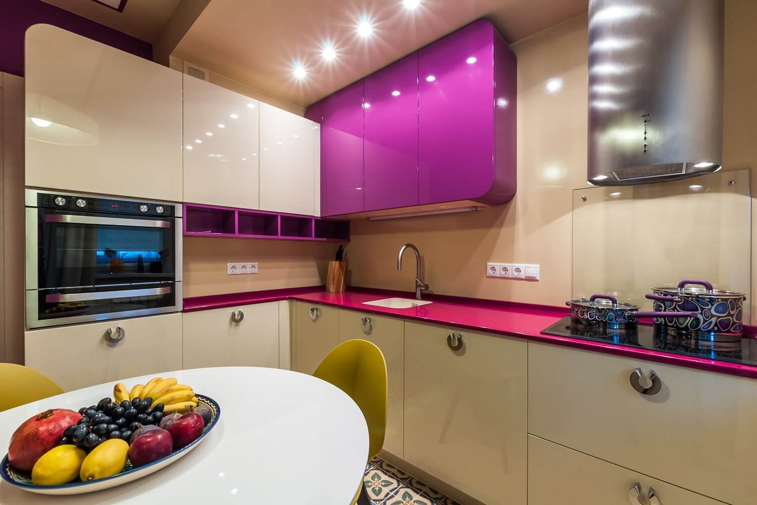 Дизайн современной, лаконичной, угловой кухни в стиле минимализм отлично подходит для небольших по размеру студий и хрущевок. Прямые однотонные фасады кухонного гарнитура без фрезеровки и рисунка могут иметь глянцевую поверхность, визуально увеличивают пространство. Отсутствие декора и стеклянных фасадов помогает избежать эффекта захламленности. Рекомендуется остановиться на светлых фасадах: белом, бежевом, салатовом, нежно-розовом.