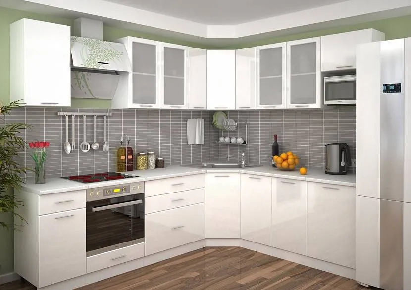 Под угловым гарнитуром для кухни подразумевают комплект мебели, где модули размещаются двумя рядами. При этом, эти ряды размещены под прямым углом относительно друг друга. Такое решение универсально, угловой кухонный гарнитур одинаково хорошо впишется и в большую и в маленькую кухню