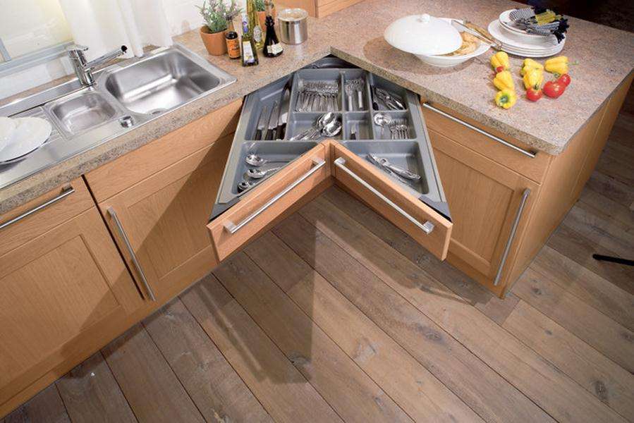 Такие углы очень вместительные, а также удобные, поскольку места перед мойкой или плитой гораздо больше. Одновременно недостатком станет сильно глубокий скошенный угол, что усложнит доступ к фартуку