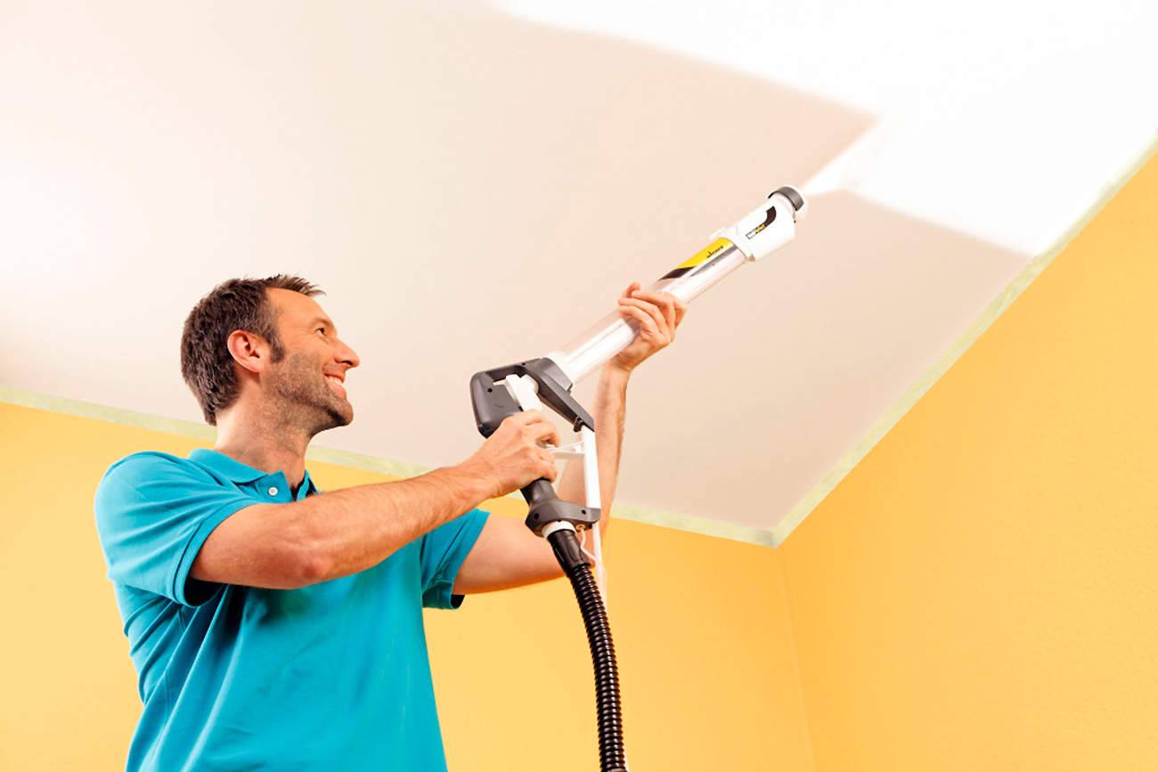 Она будет стандартной для всех водоэмульсионных составов. Необходимо зачистить отлаивающуюся штукатурку. Для этого подойдет шпатель. Это относится и к пораженной грибком штукатурки. Пыли будет меньше, если вы два раза смочите потолок при помощи распылителя или валика. При этом между смачиваниями должно пройти несколько часов.