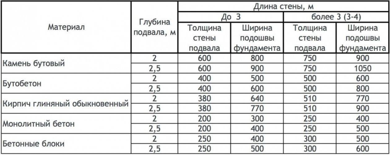 Таблица рекомендуемых пропорций фундаментов в зависимости от расстояния.