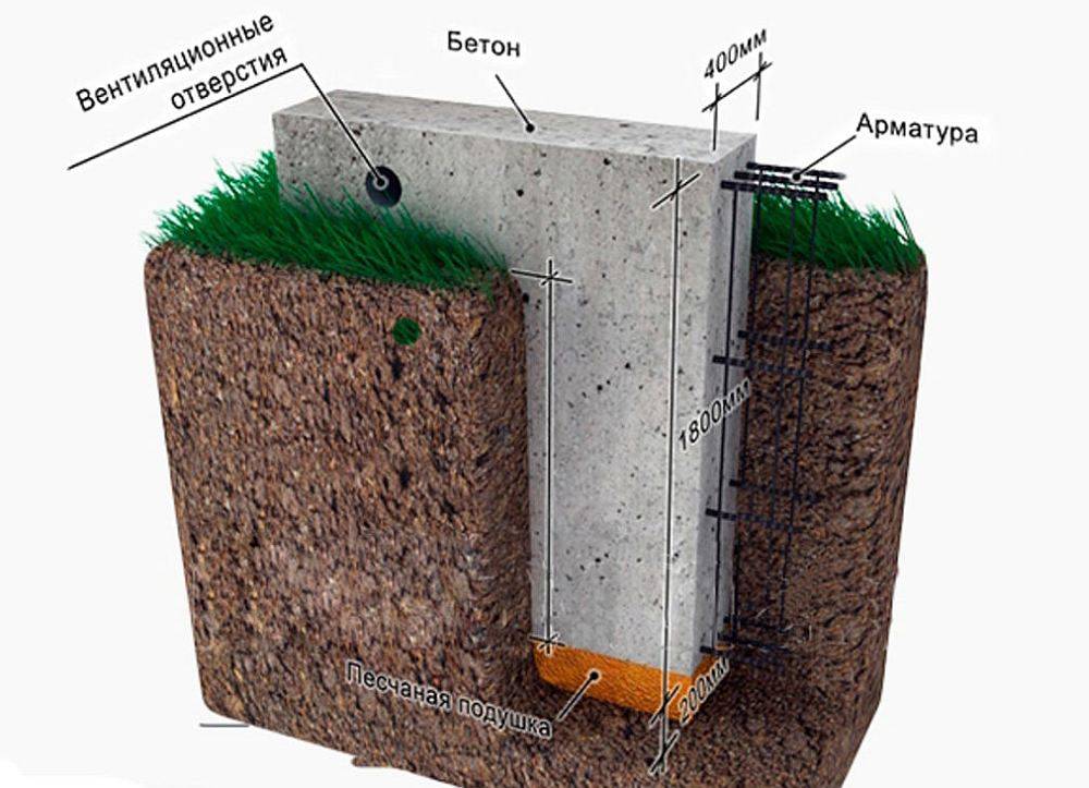- Бетонная основа без заглубления. Мелкозаглубленный ленточный фундамент, выполненный своими руками, используется в регионах, где практически отсутствует мягкий грунт, а заглубление невозможно ввиду наличия скалистых пород.