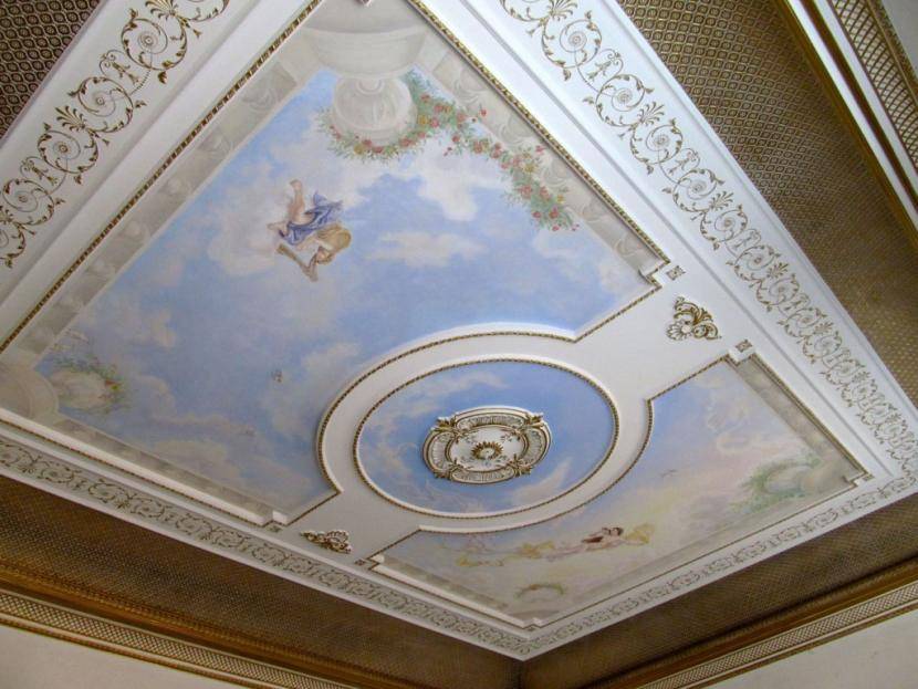 - На последней стадии проводится художественная окраска и отделка лепнины. Процесс может включать тонирование, роспись, альфрейную живопись, имитирующую отделку под камень или дерево.