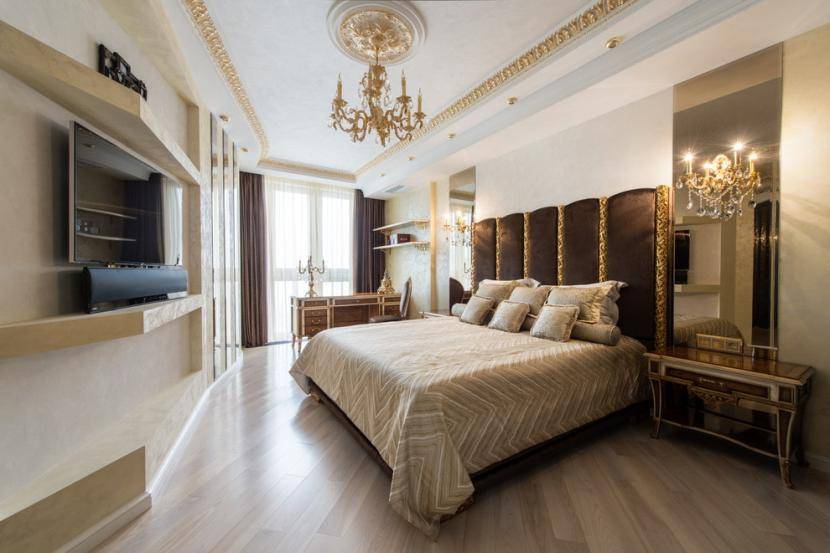 Если стены хочется оставить пустыми, то лепнину можно с успехом разметить на потолку или на мебели. Про то, как подчеркивать красоту люстры мы уже рассказали несколько раз.