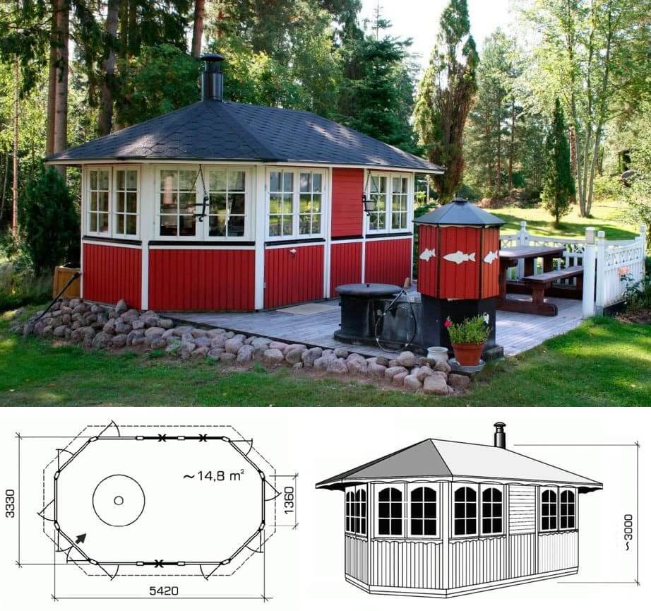 Размеры зависят от планов по её использованию. Стандартный — примерно от 9 до 12 квадратов. Плюсы в том, что использовать закрытое помещение можно круглогодично, бытовая техника и мебель не подвержены капризам природы, а свободный доступ (если это дачный участок) посторонним ограничен.
