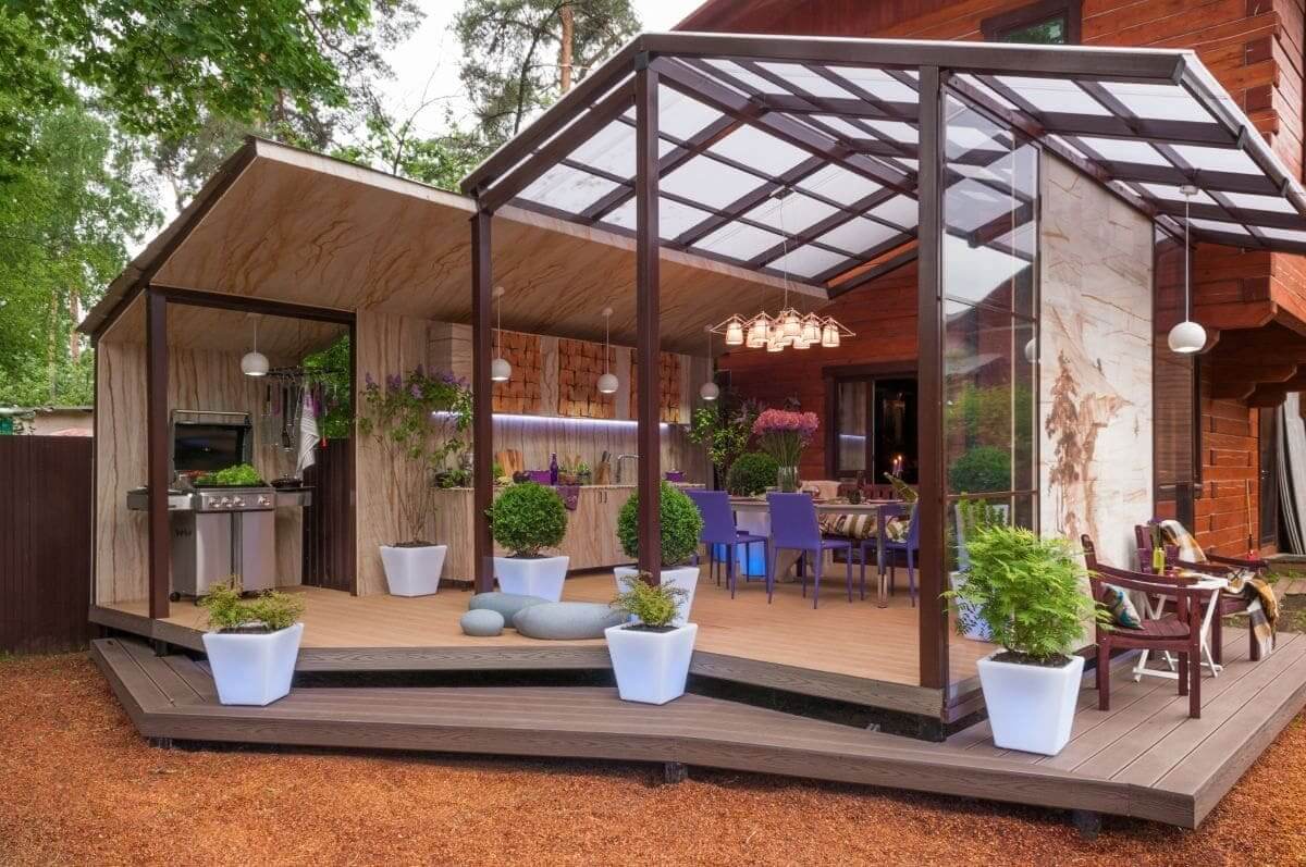 Комбинация кухни с террасой или навесом отлично решает проблему помещений небольших площадей, столовая зона выносится за пределы места для готовки и довольно вместительна. Конструкция крыши проста и при наличии стройматериала выполняется быстро.