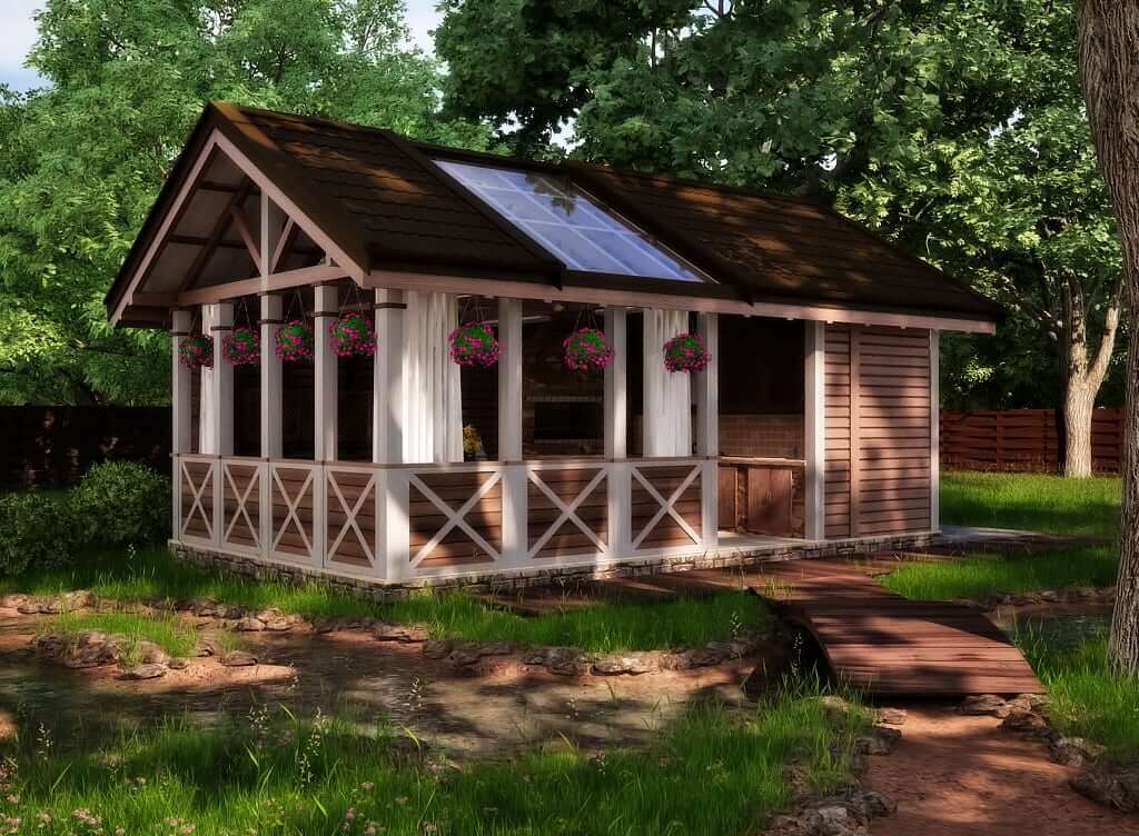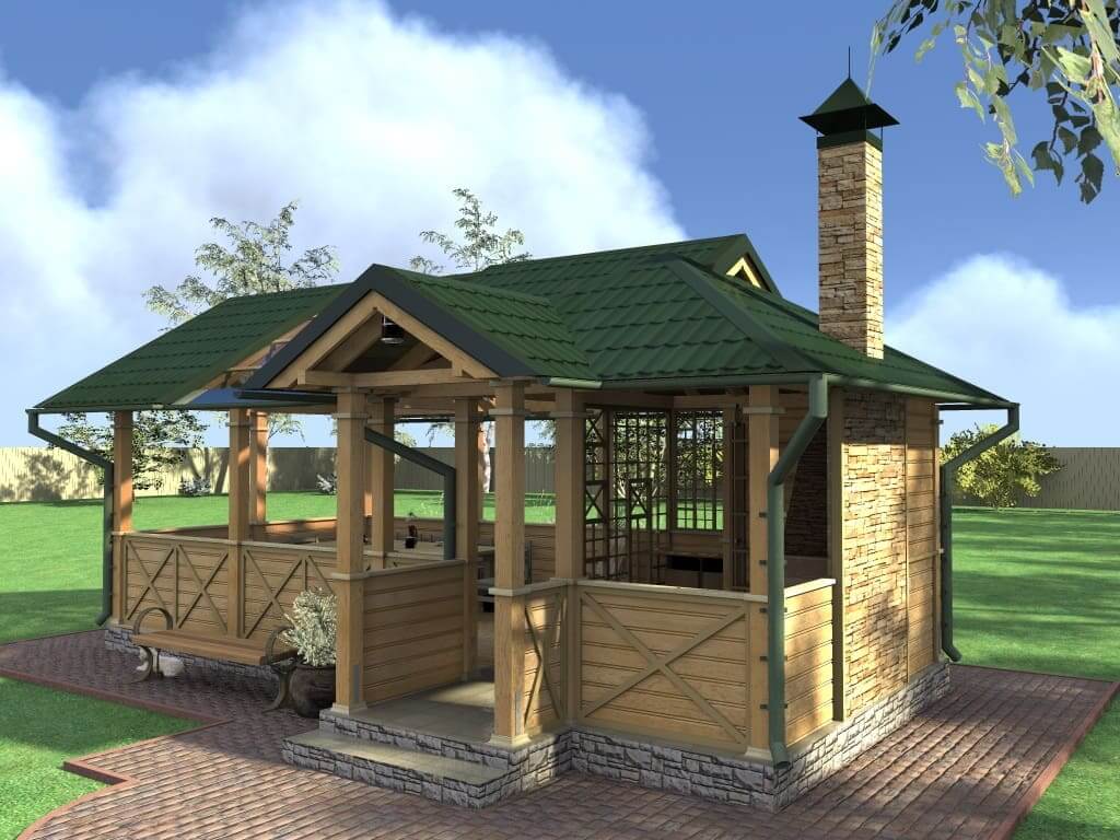 Обычно располагается недалеко от дома, представляет собой каркасную конструкцию с потолком. По сторонам можно повесить легкие шторы, чтобы частично оградить себя от насекомых и ветра с дождем. Это бюджетный вариант для небольших садовых участков.