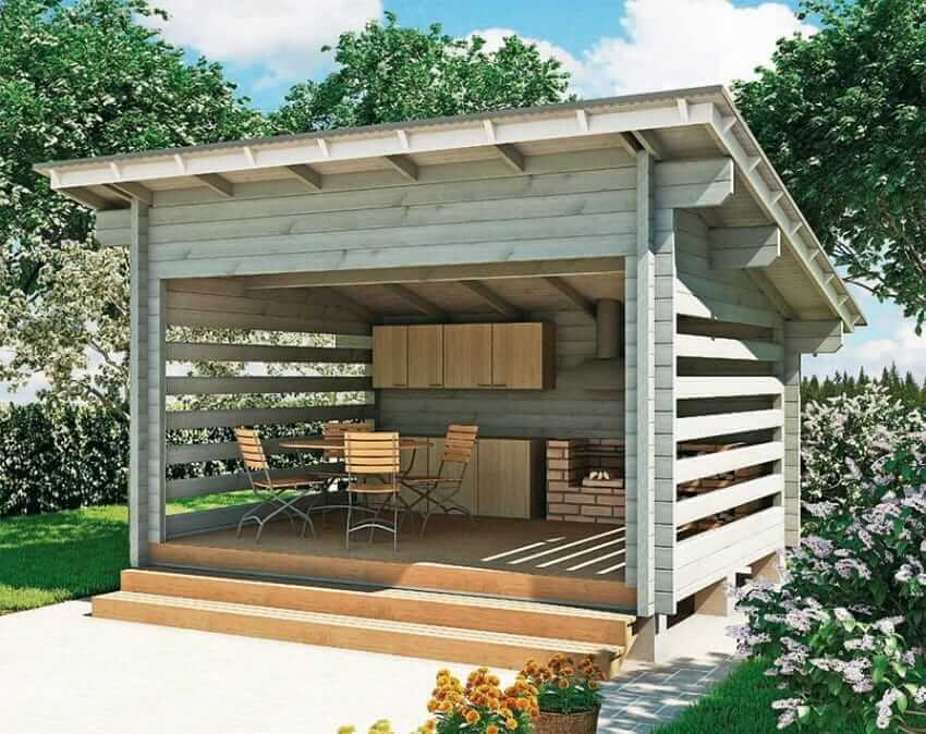 Небольшая деревянная летняя кухня с односкатной крышей