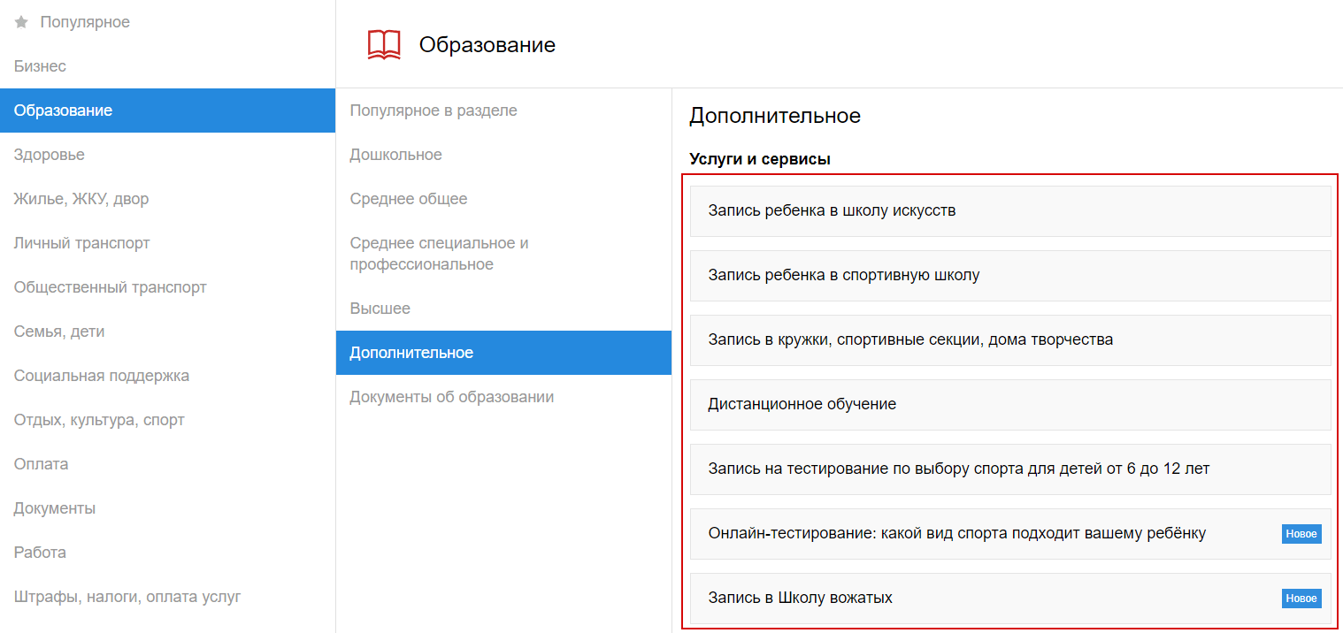 - Образование. Запись на дошкольное, среднее, высшее или дополнительное профессиональное образование. Проверка электронного дневника, оплата курсов, получение результатов экзаменов, оформление карт учащегося.