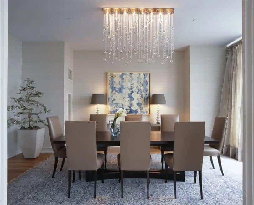 В каждой семье гостиная может играть различные функции, иногда их несколько. Это место для отдыха, просмотра фильмов, ведение бесед, здесь могут играть дети. Иногда в гостиной обустраивается рабочая зона, но чаще вся семья, иногда и друзья собираются для празднования. Обеденную зону может выделить осветительный прибор с подвесками, который сделан с хрусталя, если его разместить над столом. Это также поможет добавить уют в помещение.
