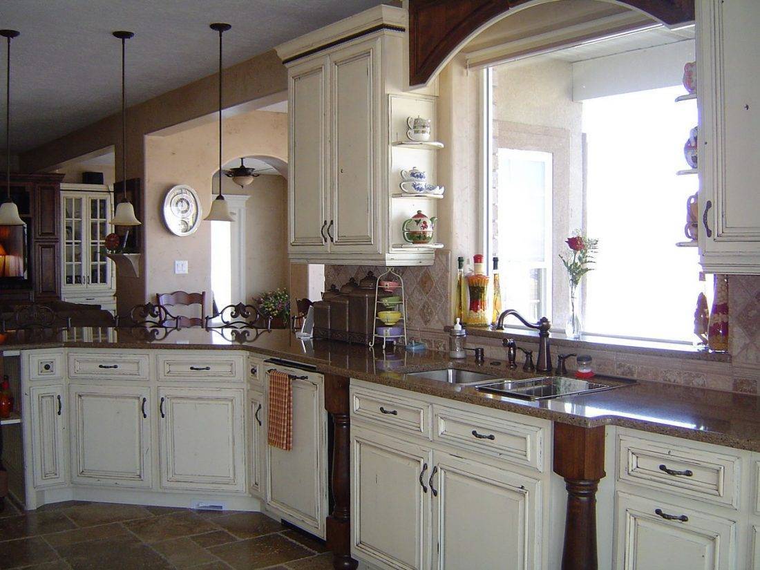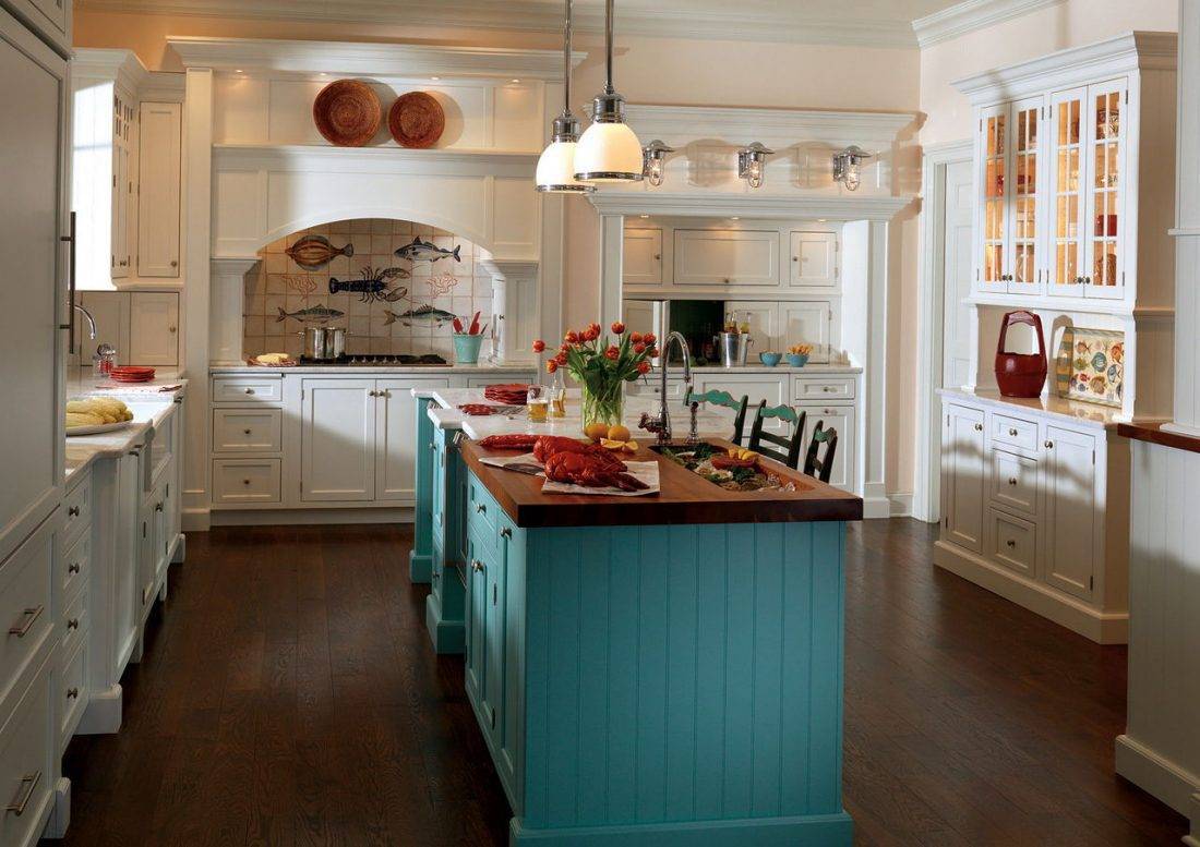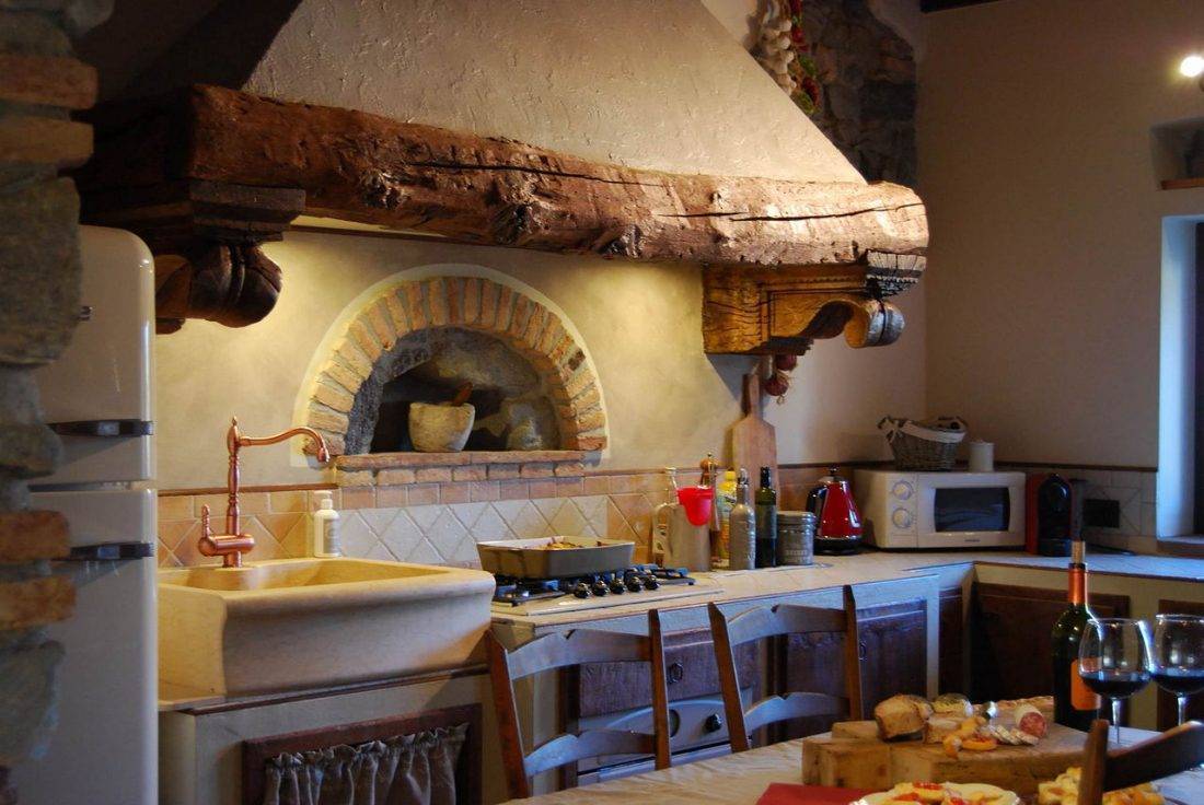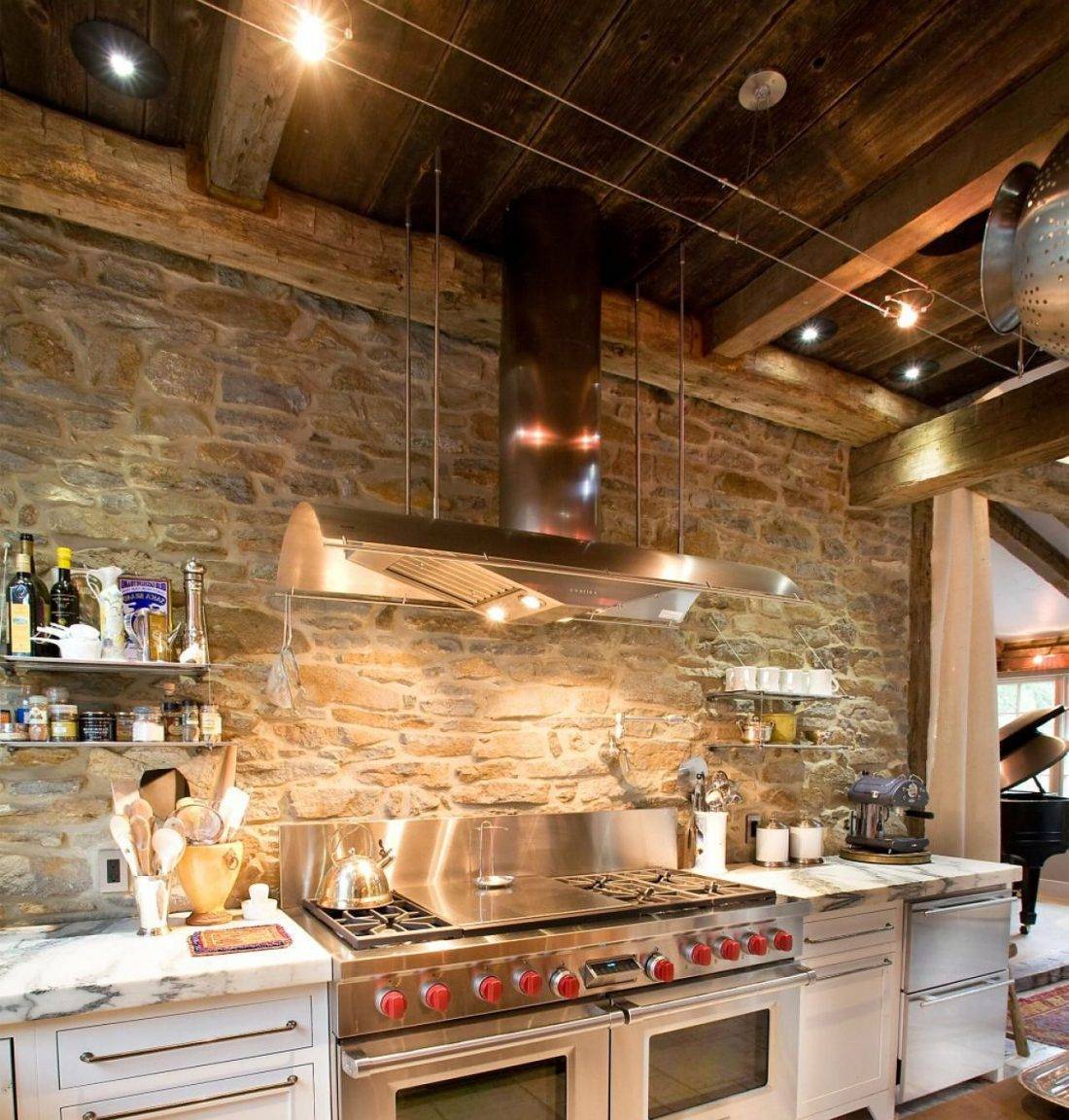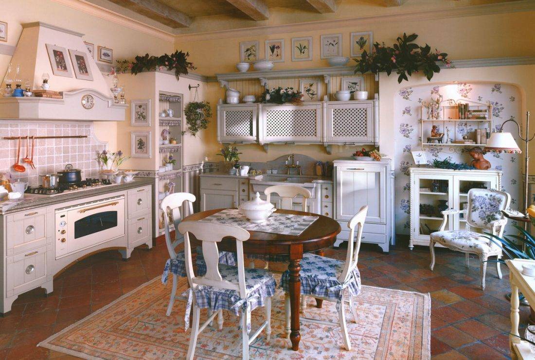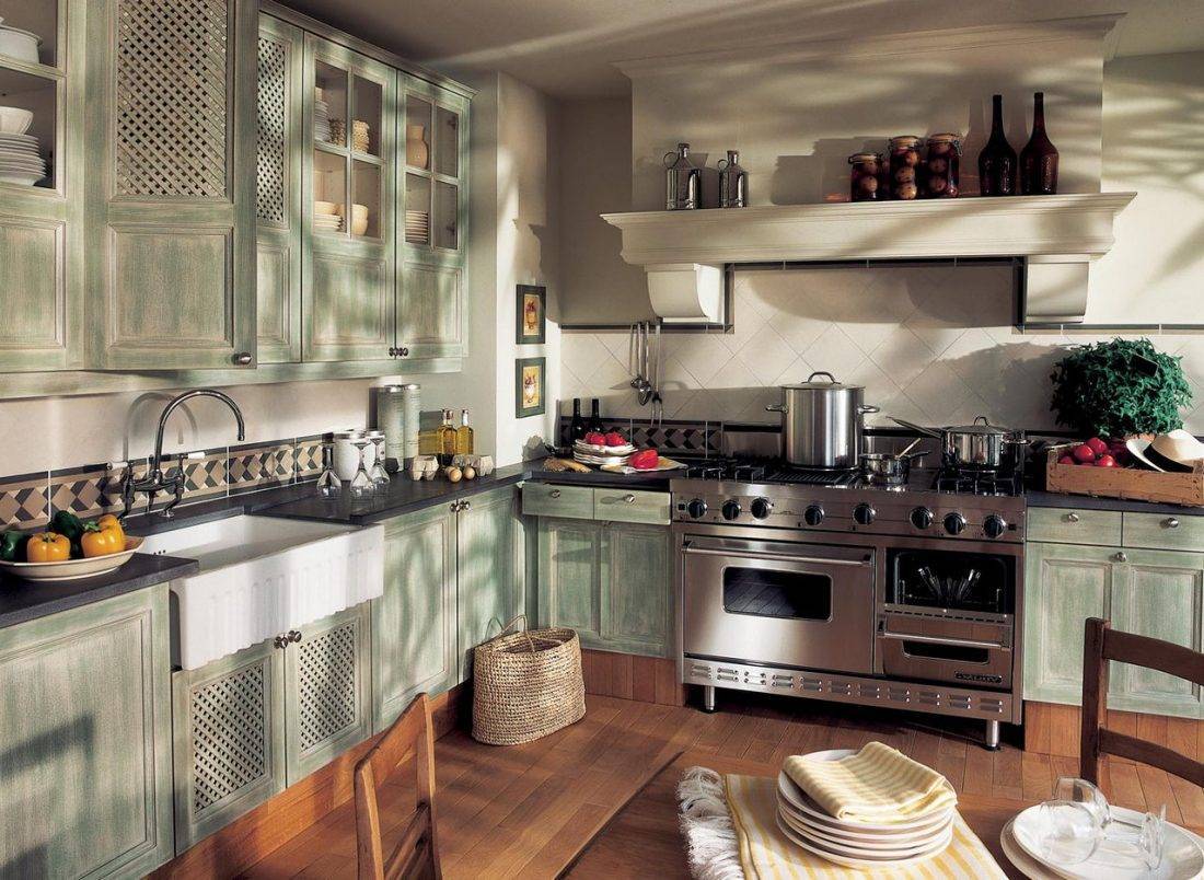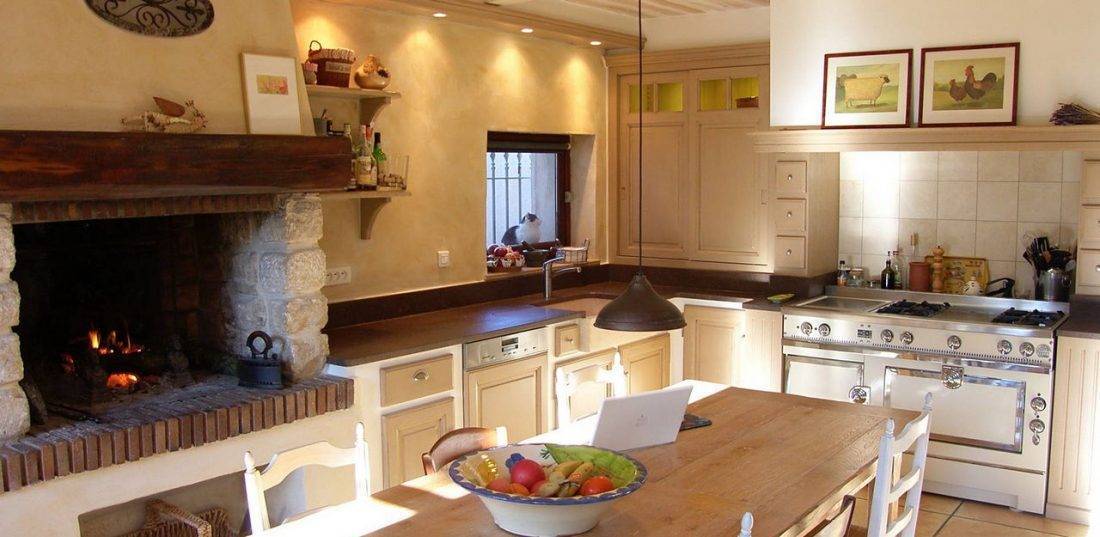 Стены на кухне штукатурятся и окрашиваются. Состаренное дерево, плитка, камень и кирпич чаще всего применяются локально, для выделения каких-либо зон. Например, «фартук» рабочей зоны облицовывается натуральным камнем, плиткой с неброским цветочным узором или мозаичной кладкой. Эти же материалы применяются для отделки пола.