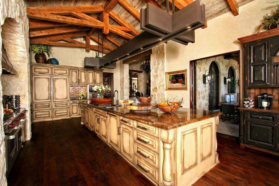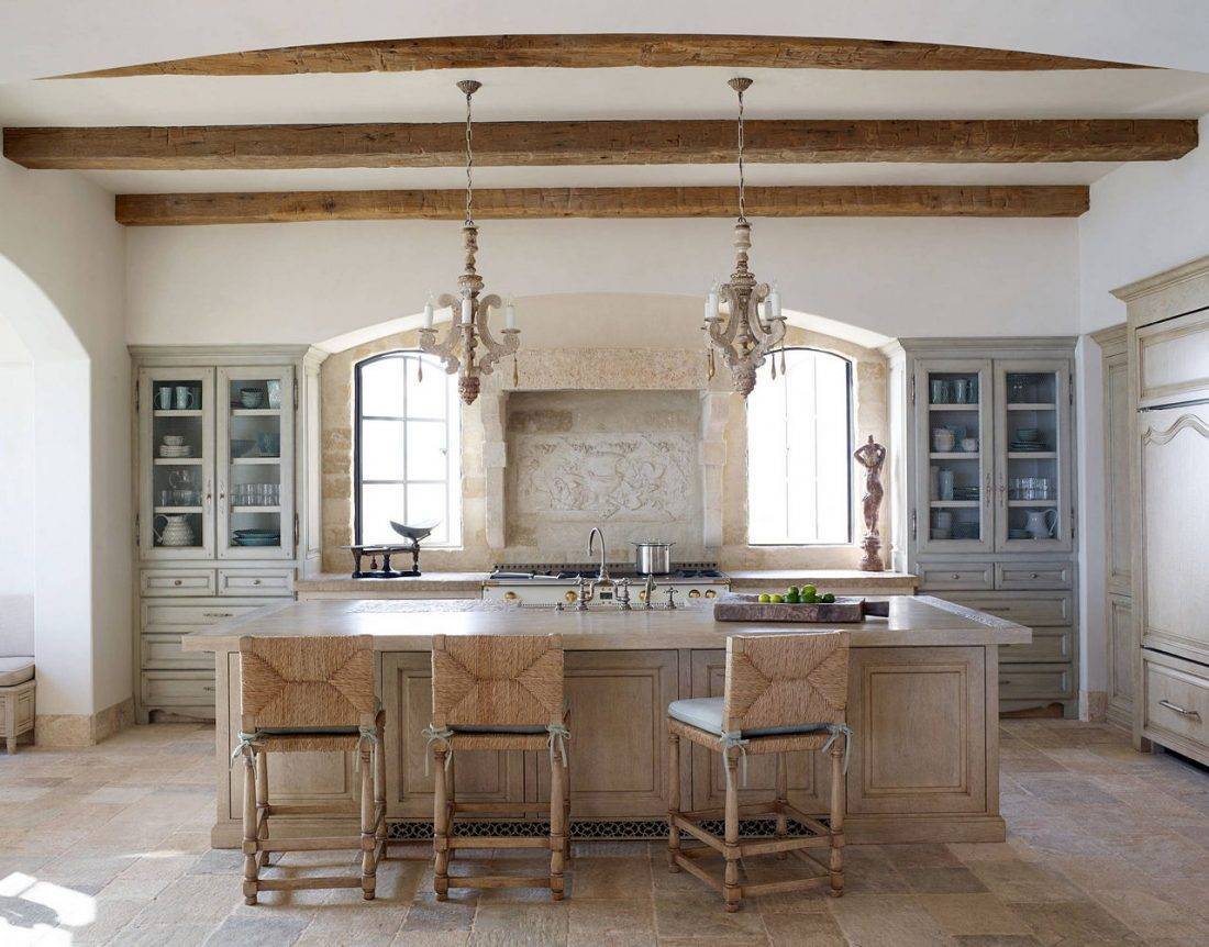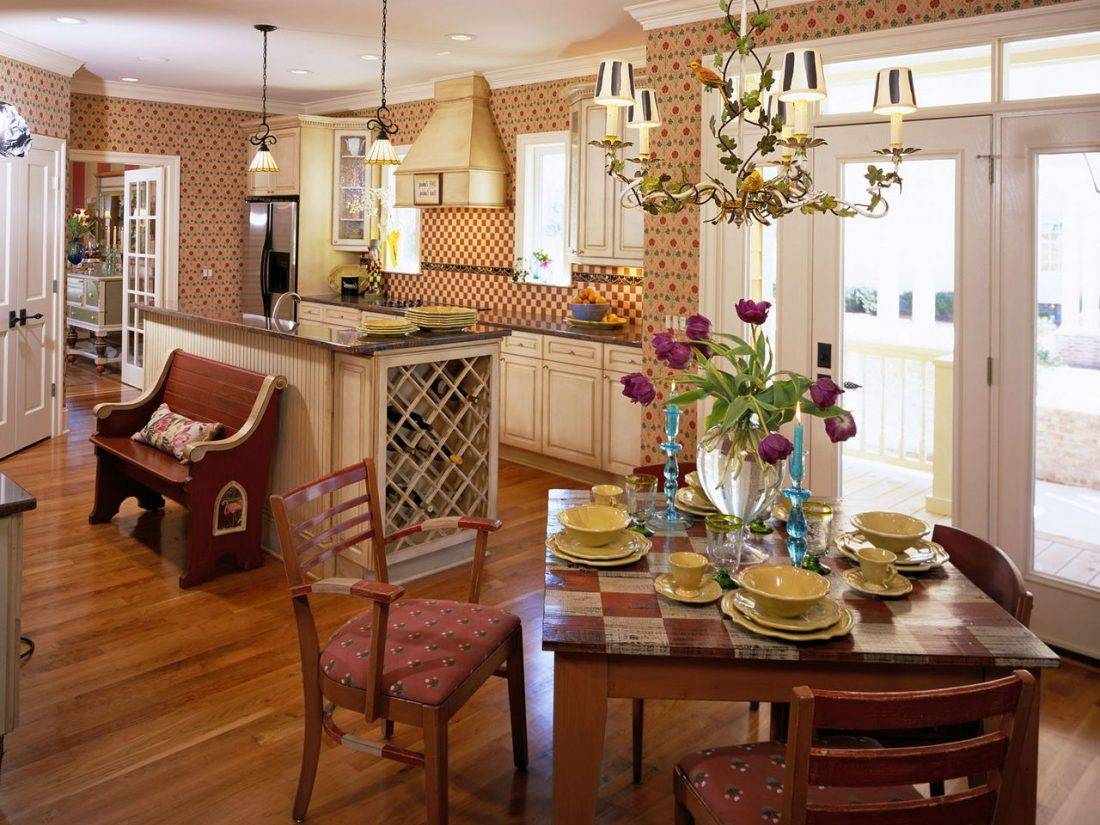 Тумба с каменной столешницей, раковина с латунным вентильным смесителем удачно впишутся в стилизованный интерьер. Небольшой квадратный стол удачно передает атмосферу деревенского дома. Буфет со стеклянными дверцами или просто прибитые деревянные полки выставляют посуду напоказ. На открытых стеллажах расставляются милые мелочи: красивые керамические тарелочки, вазочки с сухими цветами, подсвечники, плетеные корзинки.