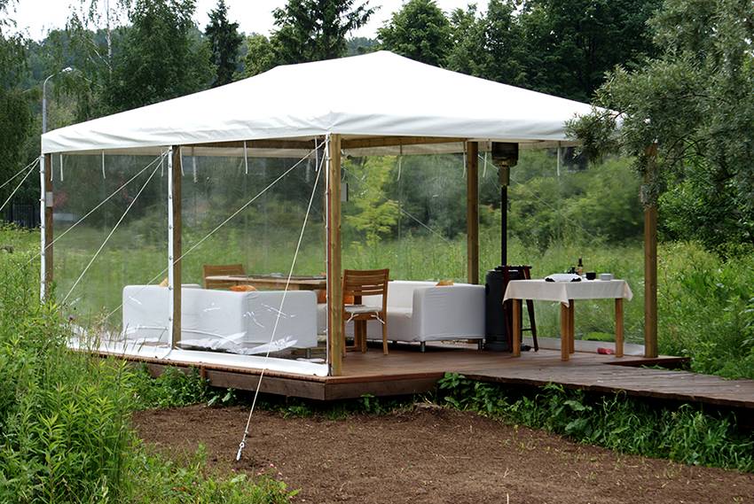 Открытые беседки, террасы и веранды представляют собой уютные, а потому любимые места отдыха хозяев домов. Однако летом эти строения подвержены атакам насекомых, а в осенне-зимний период, во время листопада, затяжных дождей, метелей, у владельцев появляется другая проблема – защита от снега, влаги и опавших листьев. Конечно, беседку можно застеклить, однако, подсчитав, во сколько обойдется подобное удовольствие, люди задаются вопросом о том, чем можно закрыть веранду, кроме стекла.