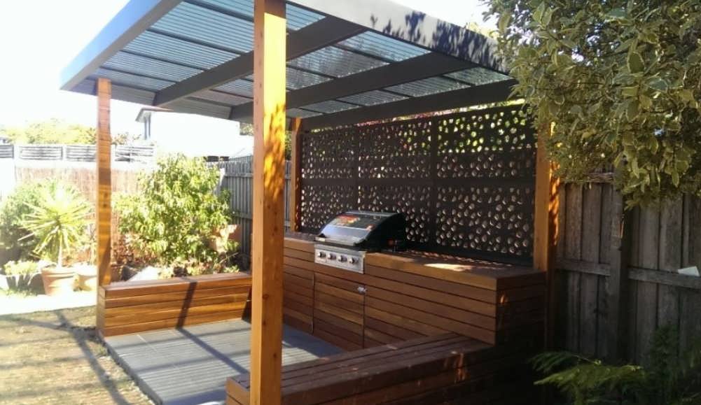 В мангальной зоне дачи на средних широтах патио уже не испанский внутренний дворик, а тот же навес или полубеседка с глухим ограждением со сторон, откуда могут подглядывать. Живая изгородь сделает мангальную зону в патио много уютнее и под нее не нужно закладывать фундамент, но, чтобы вырастить и сформировать подходящий кустарник, потребуется несколько лет. Временный вариант без капитального строительства на этот период – обшивка из профлиста или ОСП. Первая дешевле, вторая естественнее смотрится.