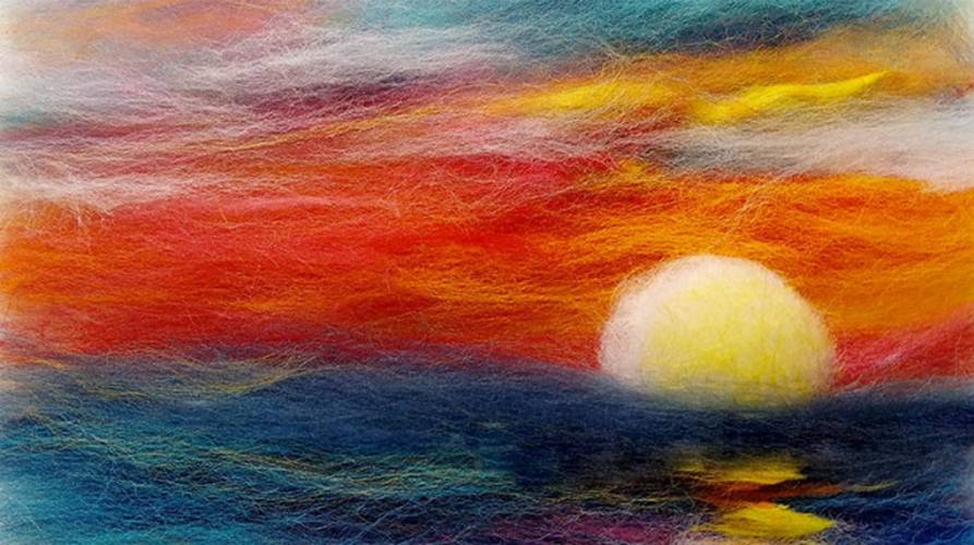 Одна из самых простых картинок для начинающих ― закат над морем. Водная гладь окрашивается в непередаваемые оттенки, повторить которые можно только смешиванием разных волокон.