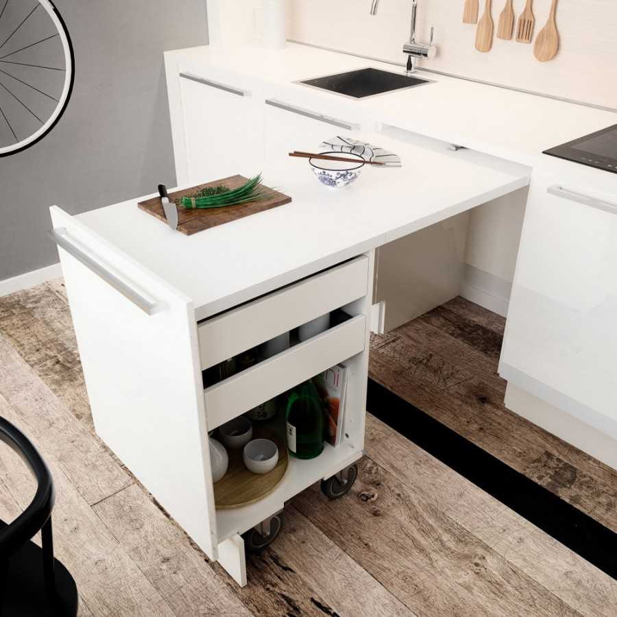 Существуют специальные модели кухонных столов, которые могут тихо маскироваться под журнальный столик. При необходимости одним движением руки можно изменить его предыдущее назначение. Существуют также столы-невидимки, которые с трудом можно рассекретить. Только хозяин при необходимости может раскрыть законспирированный во встроенную кухонную мебель обеденный столик.