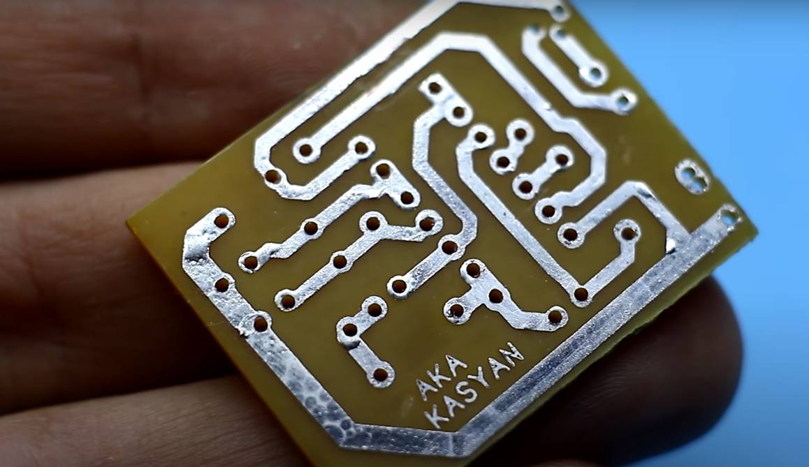 - Первым делом делается печатная плата на принтере. Ее нужно распечатать и протравить на медной плате. Для этого используется метод перевода тонера на плату. Принцип заключается в следующем: нужно распечатать зеркальное изображение платы на принтере, после чего перенести его на медную часть платы утюгом. В процессе тонер будет действовать как маска, которая сохранит дорожки, а другие части растворятся в химическую ванну. Вот как выглядит схема платы.