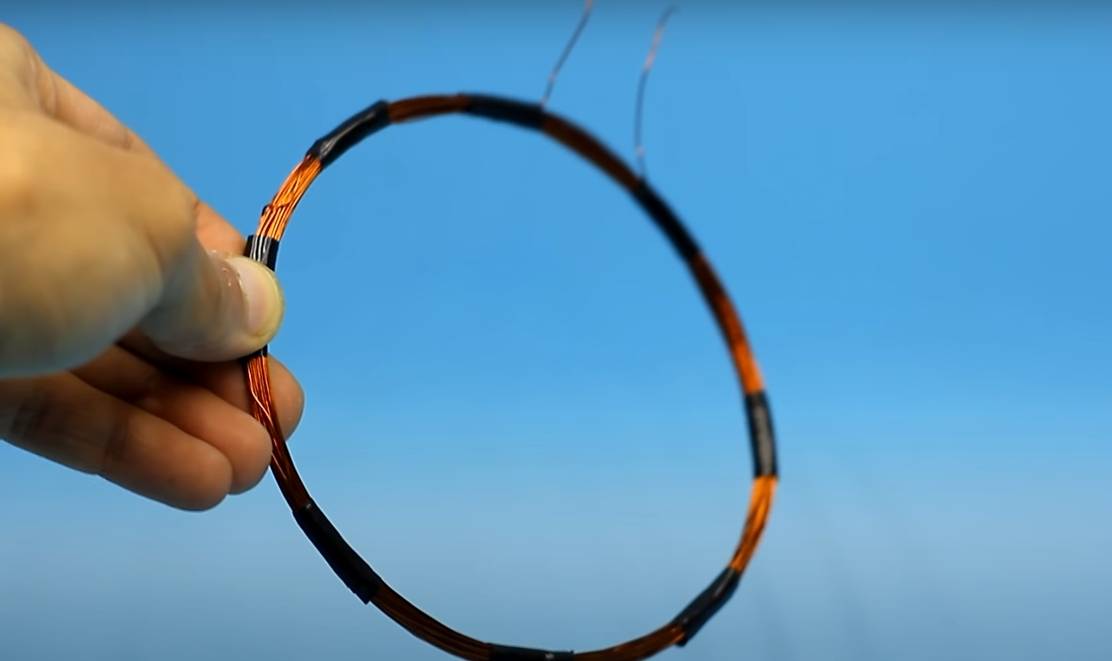 - Теперь следует протянуть каждый конец проводка в отверстия, сделанные перпендикулярно, после чего один из концов сквозь продольное отверстие. Осталось закрепить провод лентой после завершения работ. Дабы снять покрытие на торцах катушки, которая открыта, нужно использовать наждачку.