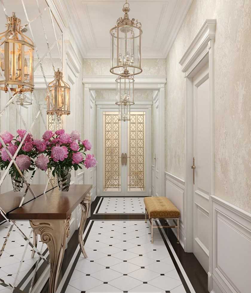 Классический стиль выигрышнее смотрится в больших просторных помещениях, но и в маленькой прихожей может красиво раскрыться, если проявить умеренность. А светлые тона отделки и зеркала в резных рамах добавят света и простора.