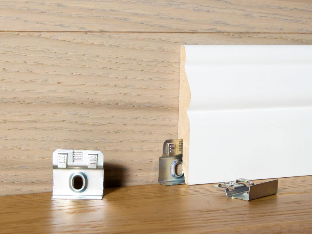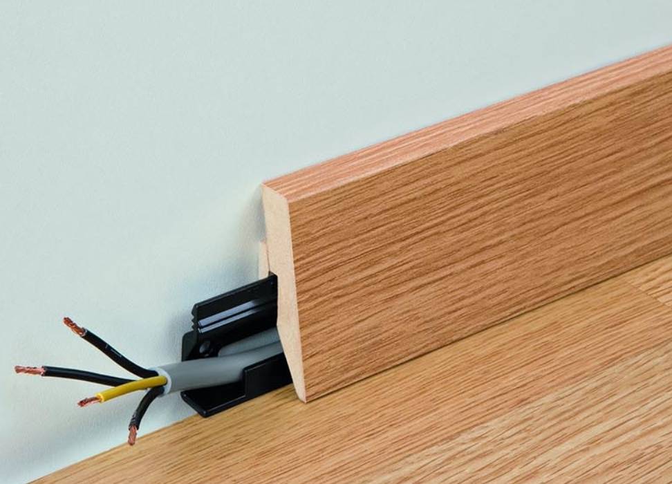 Третий способ — используется клипса для крепления деревянного плинтуса к полу, благодаря которой есть возможность в любой момент снять его с крепежа (для укладки кабелей). На поверхности крепят клипсу, потом на нее надевается плинтус с пазом.
