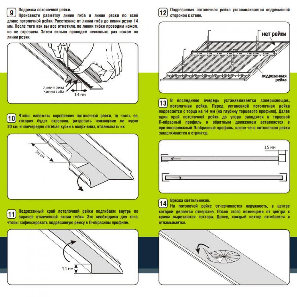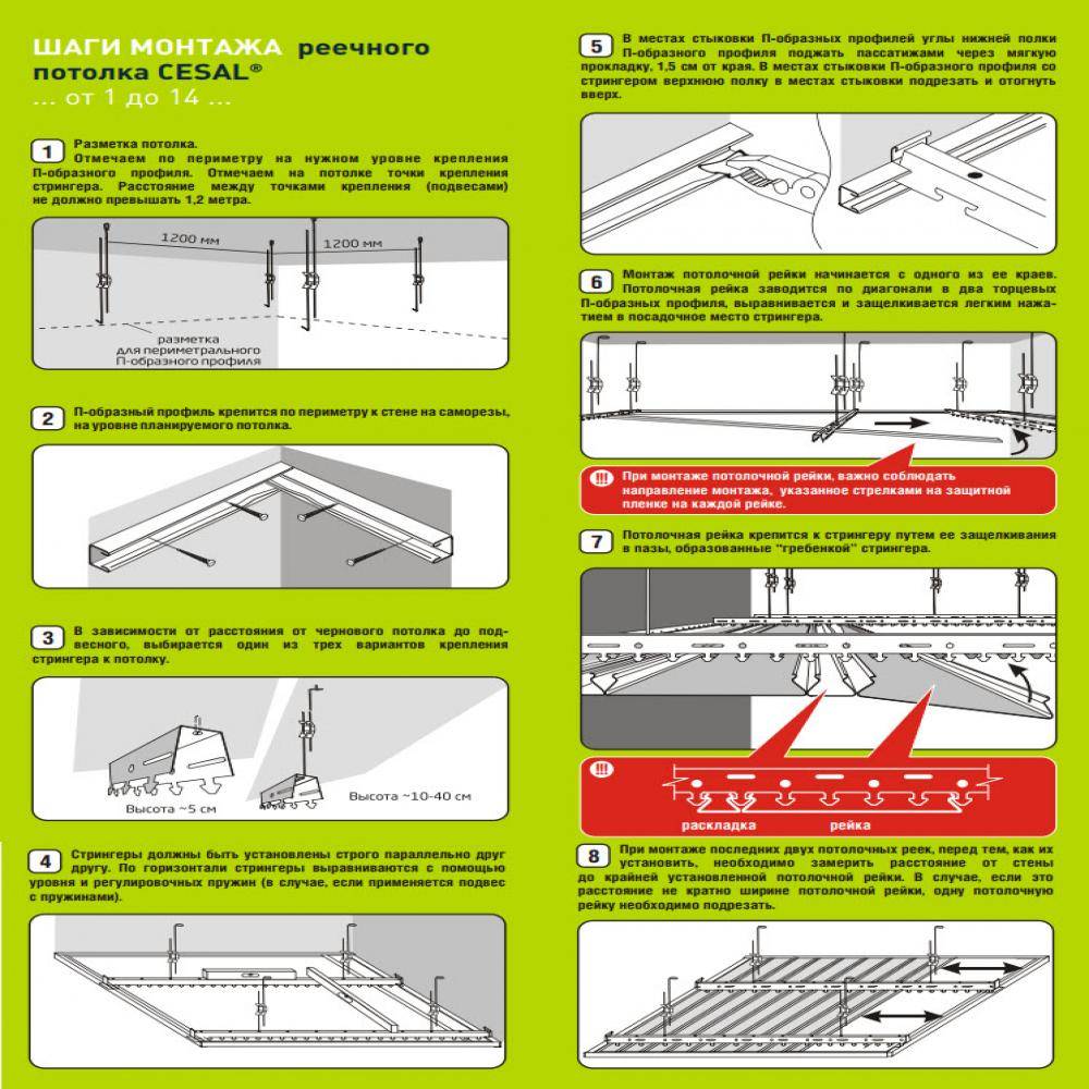 Теперь пришло время описать процесс монтажа реечного потолка своими руками в пошаговой инструкции.