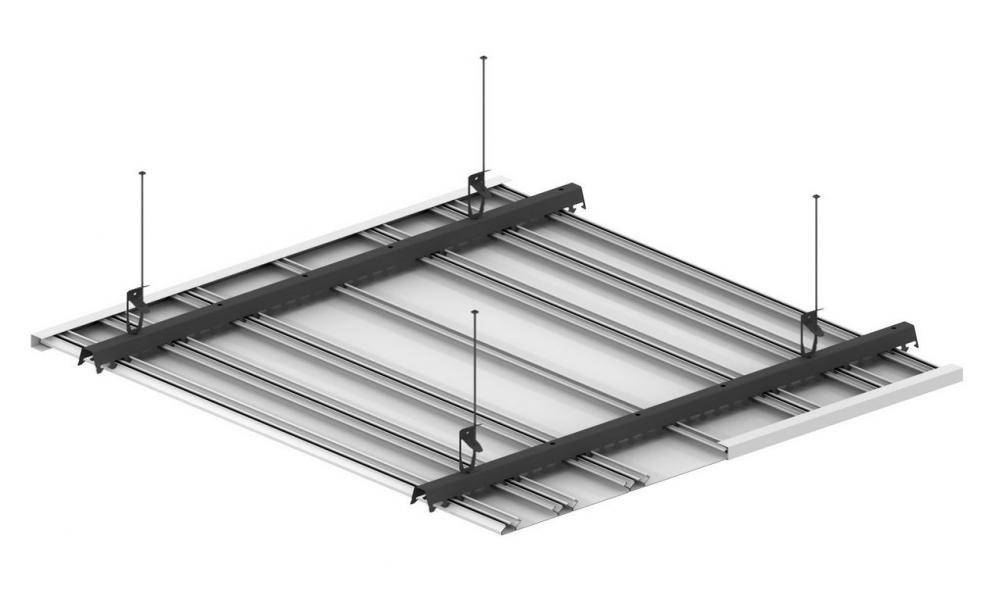 Все очень просто. На перекрытии крепятся проволочные подвесы, у которых есть возможность регулировки длины. К подвесным крюкам закрепляют несущие планки, на нижних кромках которых выполнены перфорированные пазы.