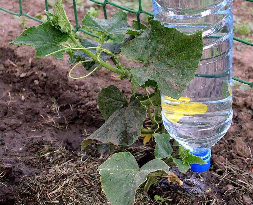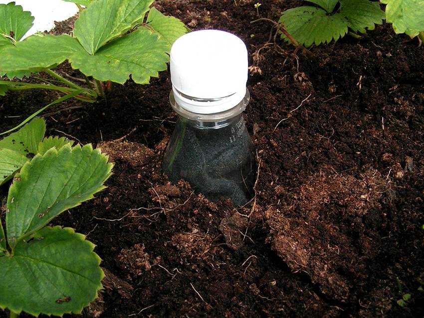 Самый популярный вариант орошения из пластиковой бутылки – это вкапывание тары между растениями