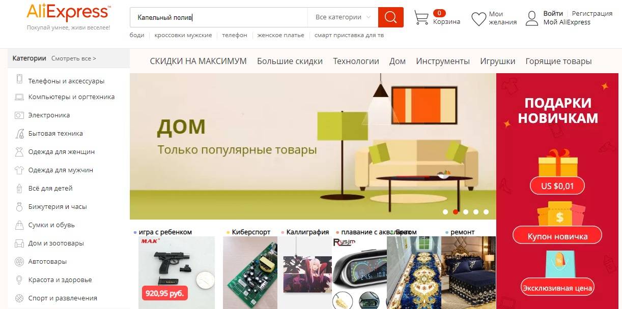 Так как для капельных поливов на площадке Алиэкспресс не предусмотрено отдельной категории, найти нужные товары легче всего через строку поиска. Пользователю необходимо просто открыть любую страницу магазина и в строку поиска ввести запрос «Капельный полив». После этого потребуется нажать клавишу Enter.