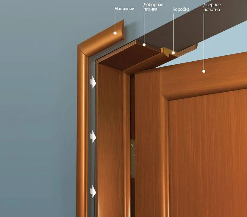 Ширина наличника должна полностью закрывать монтажный зазор между стеной и коробкой. Если он слишком большой, имеет смысл сначала заделать его шпаклёвкой и уменьшить, так как широкие планки не всегда хорошо смотрятся в сочетании со стандартной межкомнатной дверью.