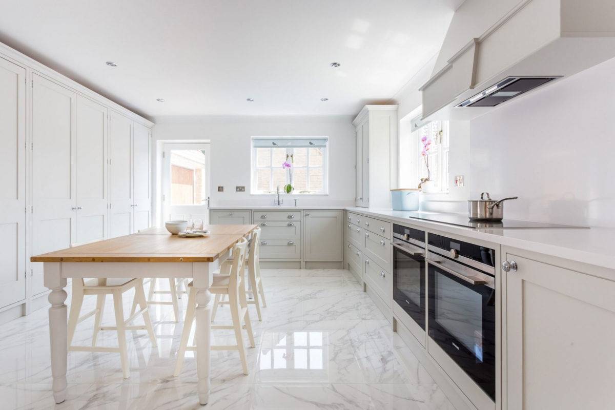 Если гарнитур, столешница и фартук выполнены в нейтральном цвете, то пол должен совпадать с каким-нибудь другим элементом интерьера (дверью, оконными рамами).
