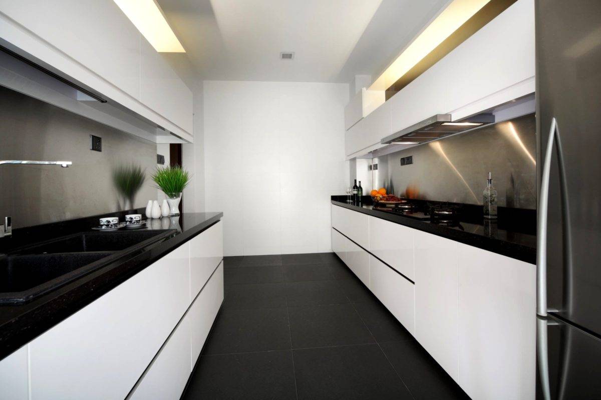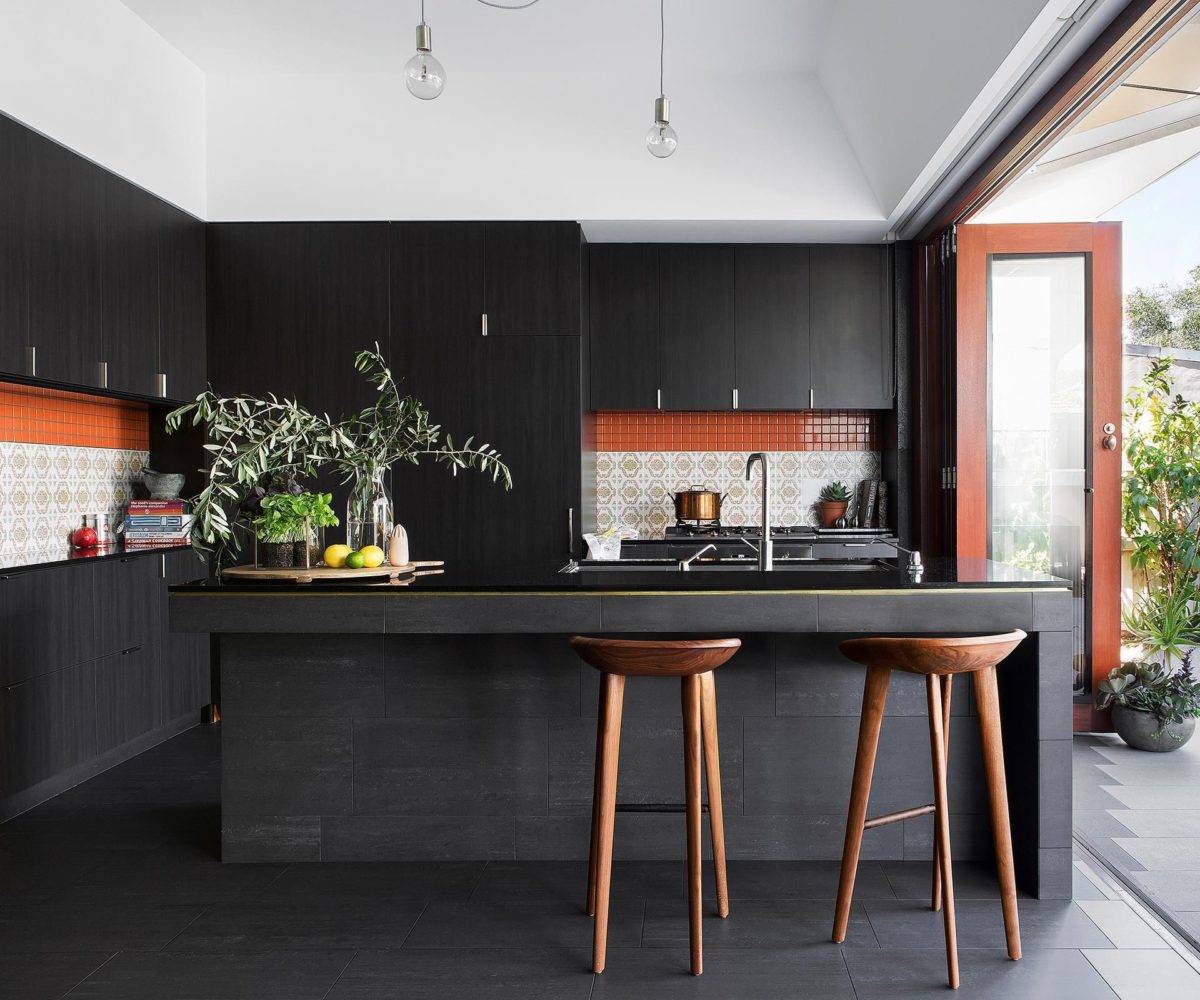 При выборе контрастного сочетания важно, чтобы пол и верхние фасады совпадали по тону. Если фартук и столешница выделяются на фоне мебели, то пол рекомендуется делать в их цветовом решении или отталкиваться от оттенков фартука