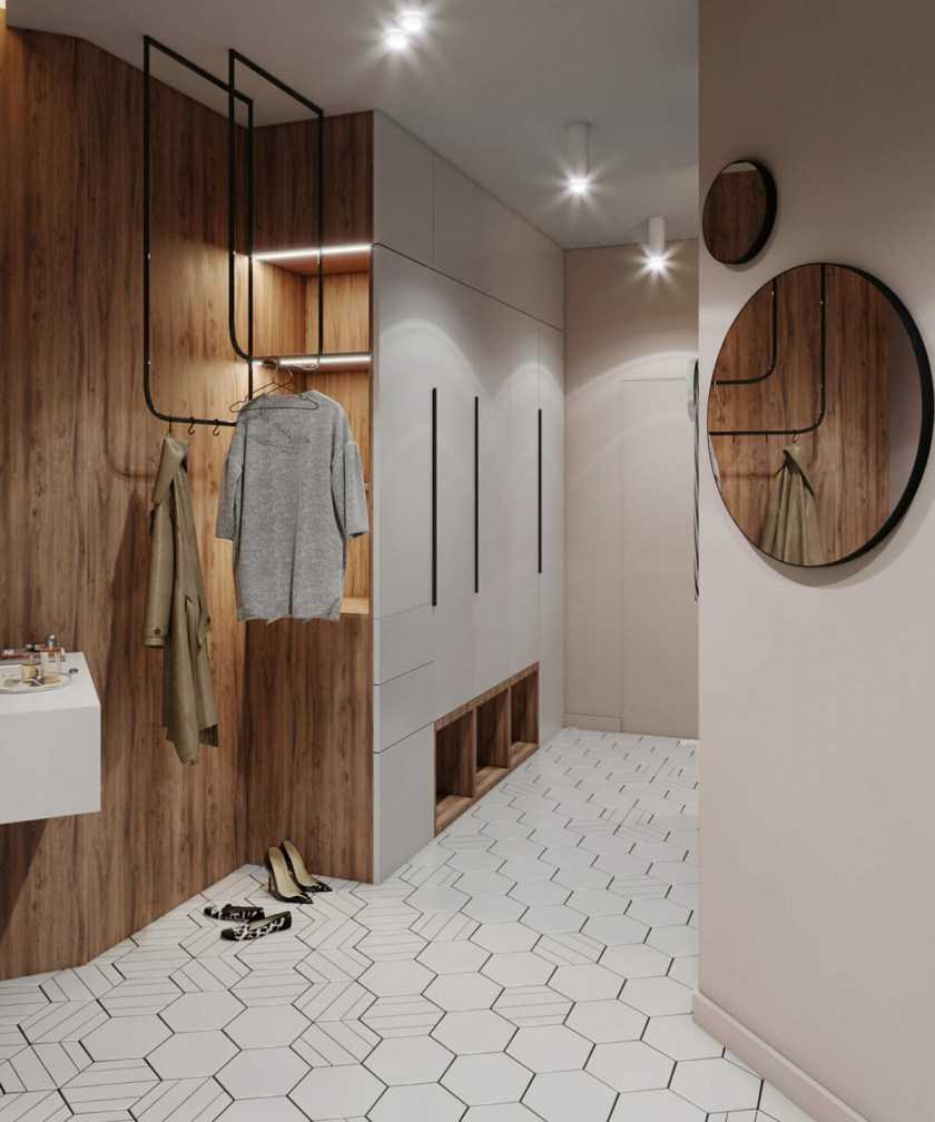 Главное – необходимо обратить внимание, чтобы вешалка по цвету сочеталась с напольным покрытием, которое может быть выполнено как из дерева, так и из керамической плитки