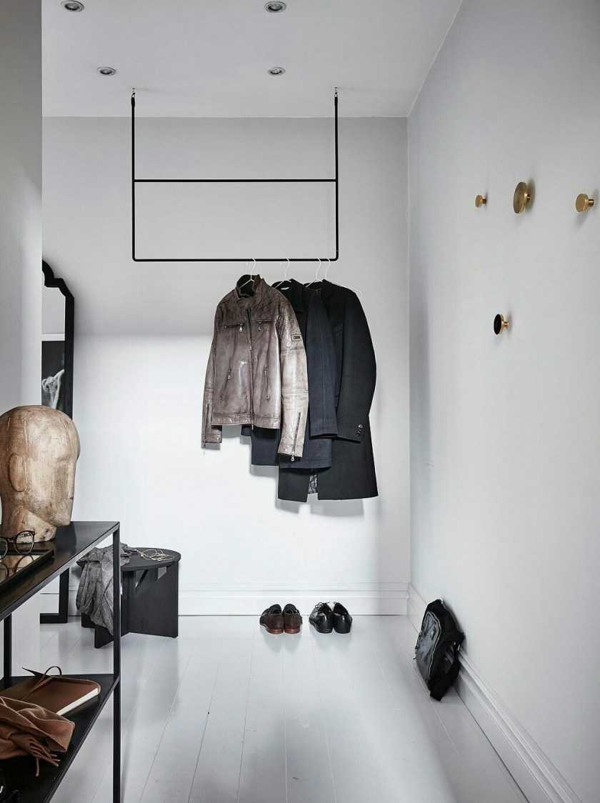 Дополнительно можно установить напольную вешалку в прихожую. Такая конструкция позволит быстро одеться или раздеться. Вам не придется развешивать мокрую от дождя или снега одежду прямо в шкаф.