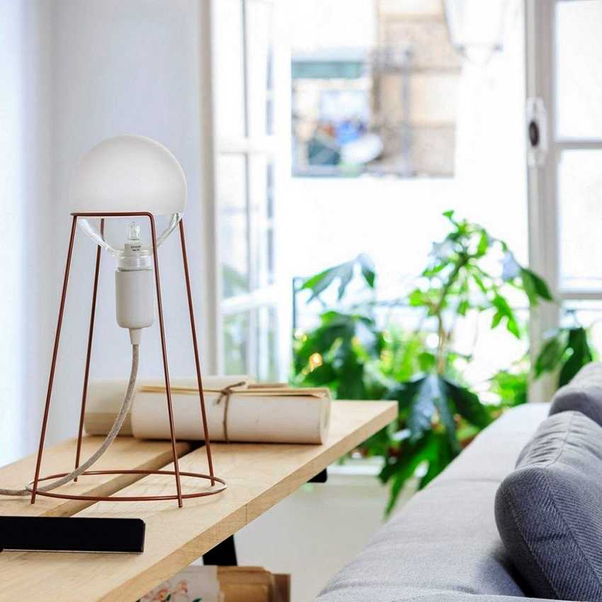 Классика жанра: лампы на высокой ножке. Их конструкция состоит из высокой и тонкой подставки (любой материал изготовления) и плафона любой формы и стиля. Такая модель считается довольно эргономичной, поскольку занимает минимум пространства на поверхности.