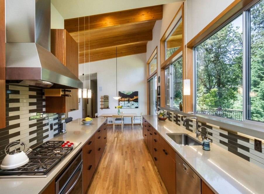 Отлично, если получится использовать специальный потолочный карниз для гардин. Так будет создаваться впечатление, что шторы спускаются из-под потолка, как на образце ниже. Это очень стильный ход, но скорее для гостиной или спальни, нежели для кухни.