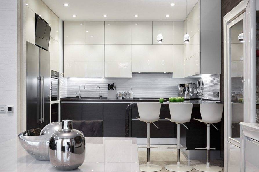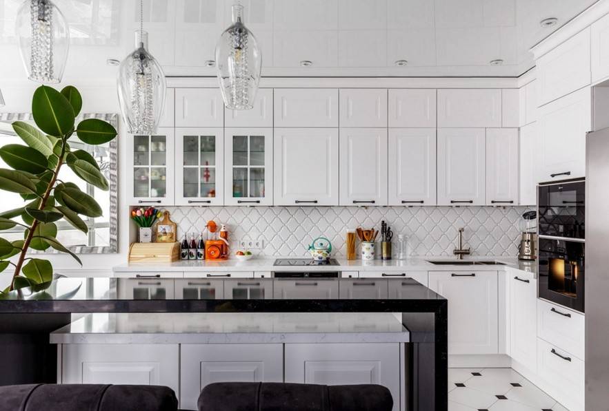 Для интерьеров в классическом стиле выбирают натяжные потолки без блеска. Они не образуют бликов, мягко рассеивают свет. Матовая поверхность смотрится дорого и элегантно, придает уют. Благородно выглядят сатиновые покрытия: мелкозернистая фактура частично отражает свет, образует легкое перламутровое сияние. На полотне малозаметны стыковочные швы. Глянцевый потолок подчеркивает футуристичность современных стилей, делает кухню светлее, зрительно увеличивает пространство.